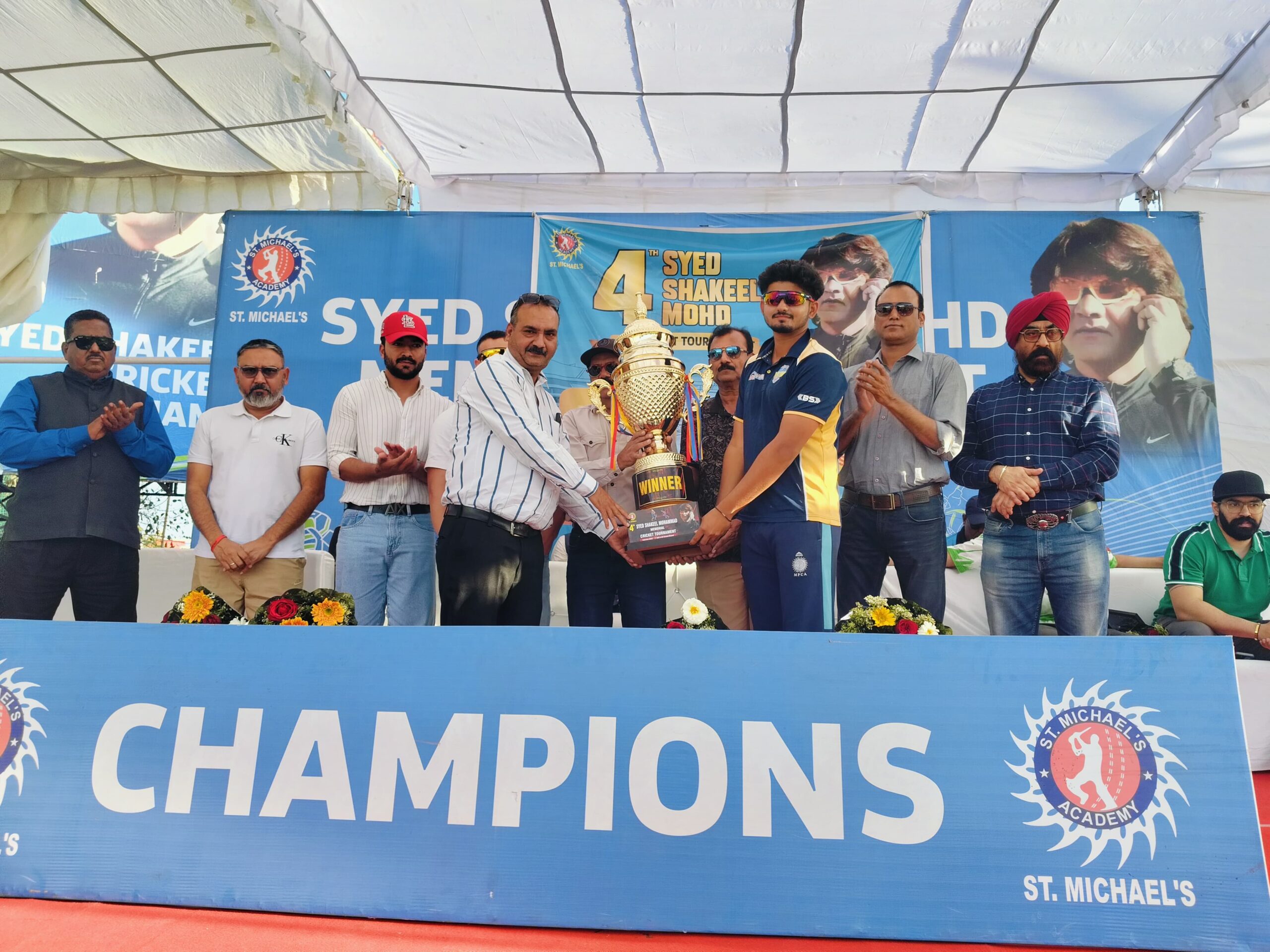 भोपाल, स्थानीय बाबेअली खेल मैदान पर खेली जा रही चतुर्थ सैयद शकील मोहम्मद ऑल इंडिया T-20 क्रिकेट प्रतियोगिता में आज दो फाइनल मुकाबले खेले गए जिसमें एकेडमी ग्रुप में सेंट माइकल क्रिकेट अकादमी और एलबीएस दिल्ली के बीच फाइनल मुकाबला खेला गया जिसमें सेंट माइकल ने पहले बल्लेबाजी करते हुए संजोग के 38 रन और सचिन राव के 32 रन के सहारे 144 रनों का लक्ष्य रखा । यथार्थ और दीपेश ने दो ,दो विकेट प्राप्त किए। एलबीएस की तरफ से तेजस ने 79 और दीपेश ने 53 रनों के सहारे 7 विकेट से यह फाइनल मुकाबला जीता। इस मैच के मैन ऑफ द मैच दीपेश रहे। आज का मास्टर ग्रुप का फाइनल मुकाबला आरएनटीयू और गोल्डन टाइगर्स के बीच खेला गया जिसमें आरएनटीयू ने पहले बल्लेबाजी करते हुए जय देवनानी 39, ज़ामरान के 36 रनों के सहारे 149 रनों का लक्ष्य रखा। अलीज़र ने 4 विकेट प्राप्त किए। जवाबी पारी खेलते हुए गोल्डन टाइगर्स अब्दुल अकील के 63 और नितेश पलिया के 35 रनों के सहारे यह मैच 6 विकेट से जीता। इस मैच का मैन ऑफ द मैच अब्दुल अकील को दिया गया। फाइनल मुकाबले के बाद इस प्रतियोगिता का पुरस्कार वितरण बीडीसीए के उपाध्यक्ष श्री जुनेद किदवई तथा बीडीसीए के सचिव शांति जैन, सीनियर क्रिकेटर श्री संजय पांडे, फैसल मीर, अयान मोहम्मद खान द्वारा किया गया। इस मौके पर सेंट माइकल क्रिकेट अकादमी के सैयद अवान शकील एवं सैयद अयान शकील मौजूद रहे।