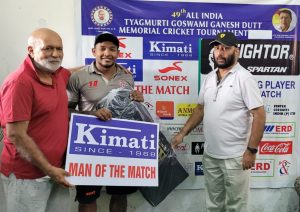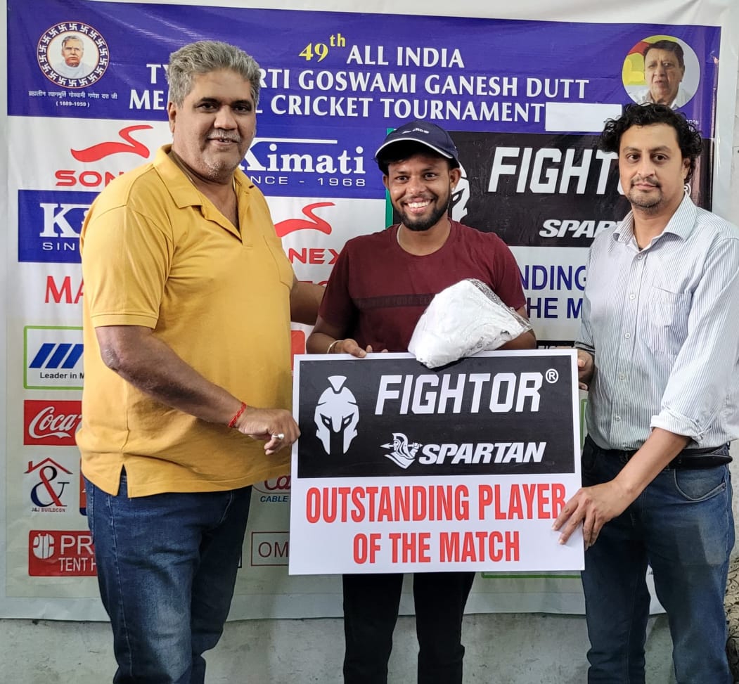 किमती मैन आफ द मैच अक्षदीप नाथ 110 रन दिल्ली चैलेंजर क्रिकेट क्लब को चुना गया उन्हें श्री अरूण खुराना (पूर्व दिल्ली व उतर क्षेत्र क्रिकेट खिलाडी) व सरदार देवेन्द्र सिंह भाटिया (टीपू जी) (सयुंक्त सचिव , गोस्वामी गणेशदत मेमरियल सोसयटी) द्वारा पुरुस्कृत किया गया जबकि फाइटर स्पारटन यंग स्टार सर्वश्रेष्ठ खिलाडी कमल सिंह भैरवा को शानदार गेन्दबाज़ी 5/27 के लिए दिया गया उन्हें श्री रजत कुलशेख (स्पारटन आर्यन क्रिकेट क्लब) व श्री सुनील कुमार (गो.गणेशदत्त मेमरियल सौसायटी, नई दिल्ली) द्वारा पुरुस्कृत किया गया।